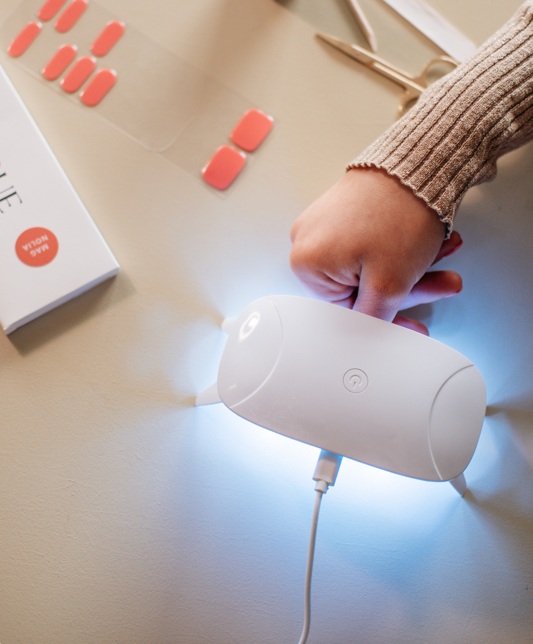 Aanbrengen is super makkelijk en snel. Kies de juiste maat, breng aan op je nagel en druk rustig aan. Na het op maat maken kun je de manicure uitharden onder de lamp. Laagje Top Coat en klaar! Je manicure blijft vervolgens 2-3 weken mooi zitten.